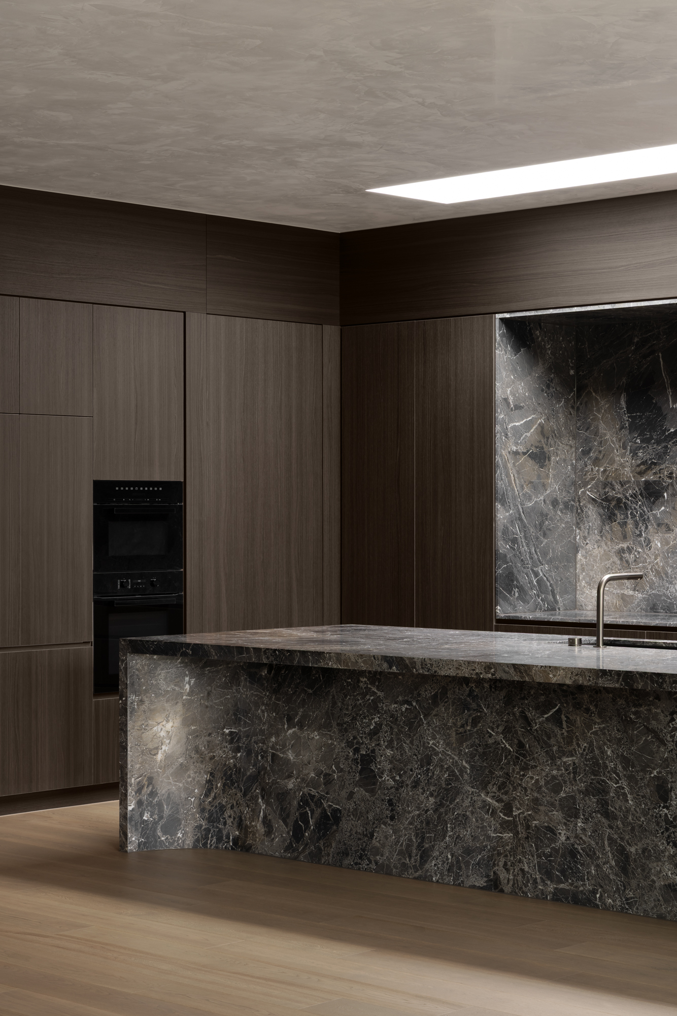 Designed by Sync Architecture, this home unites the family on a single level, offering seamless flow between private retreats and shared spaces. The interiors balance moody, timeless finishes with soft natural light, creating an atmosphere that is both grounded and welcoming. In the living room, Aperture Workshop’s Luna lamp in Rosso Levanto marble and Ash incense burner in Calacatta Viola become sculptural anchors that echo the home’s sense of drama, intimacy, and warmth.